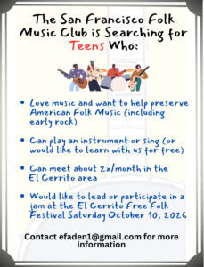 The 2026 El Cerrito Free Folk Festival will be held on Saturday October 10, 2026. The festival will once again take place at the El Cerrito Community Center, 7007 Moeser Lane in El Cerrito. The festival offers two stages of music performances, a workshop space, a Morris Dance performance and plenty of room for spontaneous jams. There will also be a two hour children’s program.